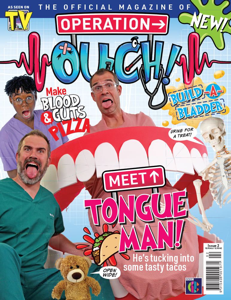 Operation Ouch Issue 2 is packed full of amazing (and sometimes gross) facts about your awesome body, like how blood is made and what it does, everyone's favourite mouth muscle the tongue, and how your bladder works! There are fun experiments, puzzles, and arts and crafts projects to do, and even blood and guts pizza to make! Enjoy following the adventures of our favourite doctors, Dr Chris, Dr Xand, and Dr Ronx, and of course Billy Bones and Mr Grumbles.